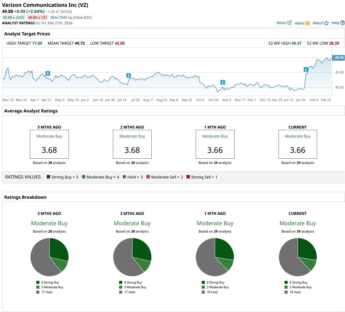 Overall, VZ stock has earned a “Moderate Buy” recommendation on Wall Street. Of the 29 analysts that cover the stock, eight rate it a “Strong Buy,” three recommend a “Moderate Buy,” and 18 suggest a “Hold.” The stock is currently trading almost exactly at its average target price of $49.72. But its Street-high estimate of $71 implies VZ stock can go as high as 42% in the next 12 months.