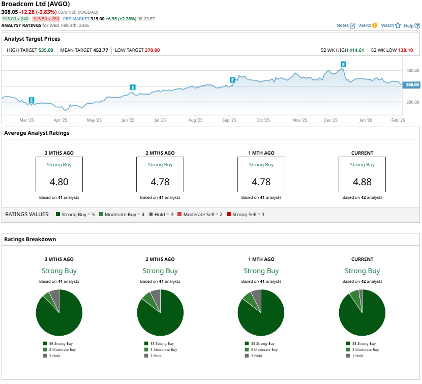 Analysts remain optimistic about AVGO stock and maintain a “Strong Buy” consensus rating. The average price target of $453.77 suggests more than 47% upside from its Feb. 4 closing price of $308.05.