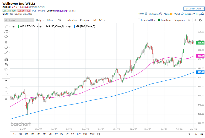 Welltower stock has traded consistently above its 200-day moving average over the past year and mostly above its 50-day moving average since early February, underscoring its bullish trend.