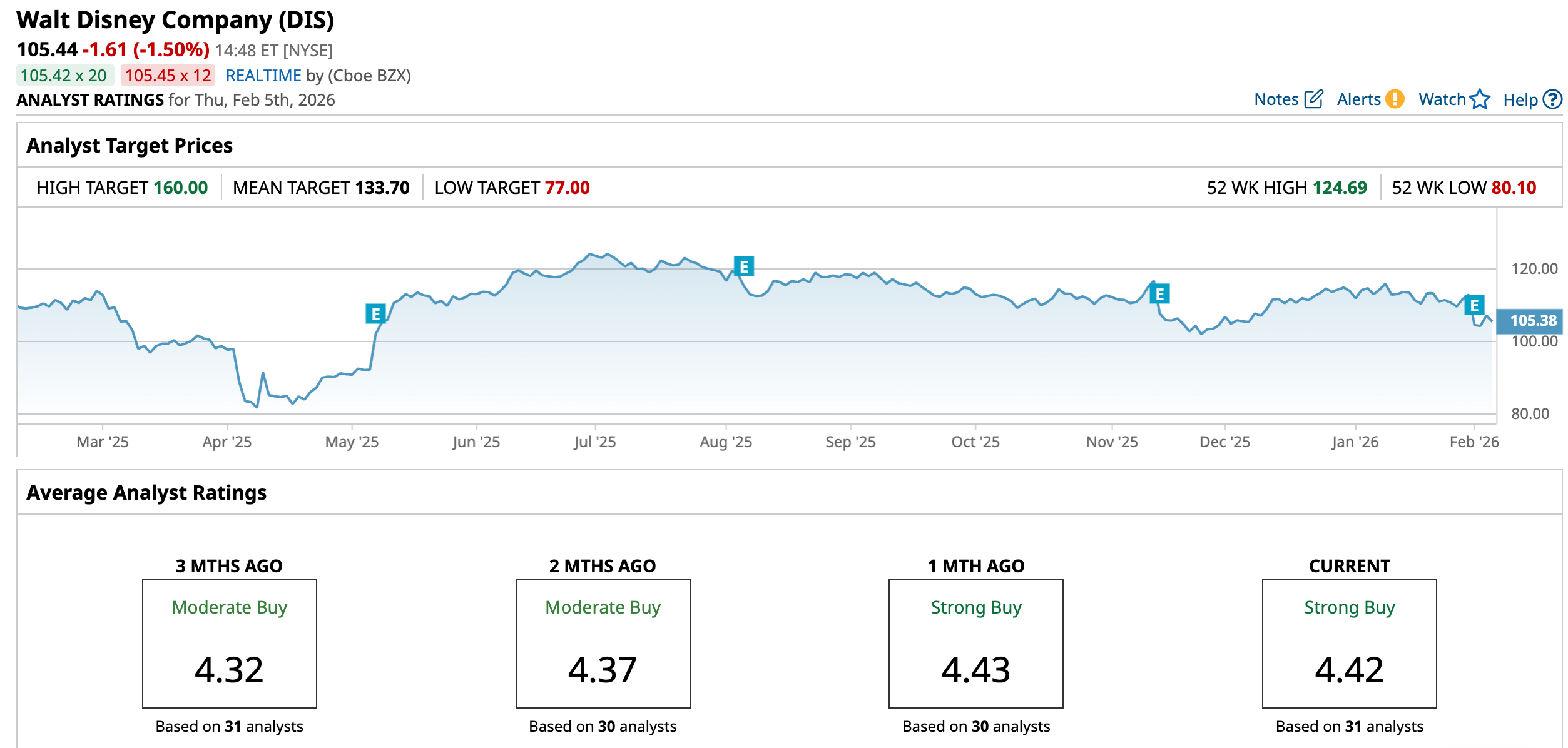 While segments like streaming and parks have shown improvement, with streaming and theme parks generating strong revenue, these gains have often been overshadowed by weaknesses in Disney’s traditional media businesses. The entertainment division, including TV and movies, has faced declining operating income and softer revenue, which has dampened investor enthusiasm and pressured the share price. Notably, the stock slumped as much as 7.4% on Feb. 2, following the latest earnings release.