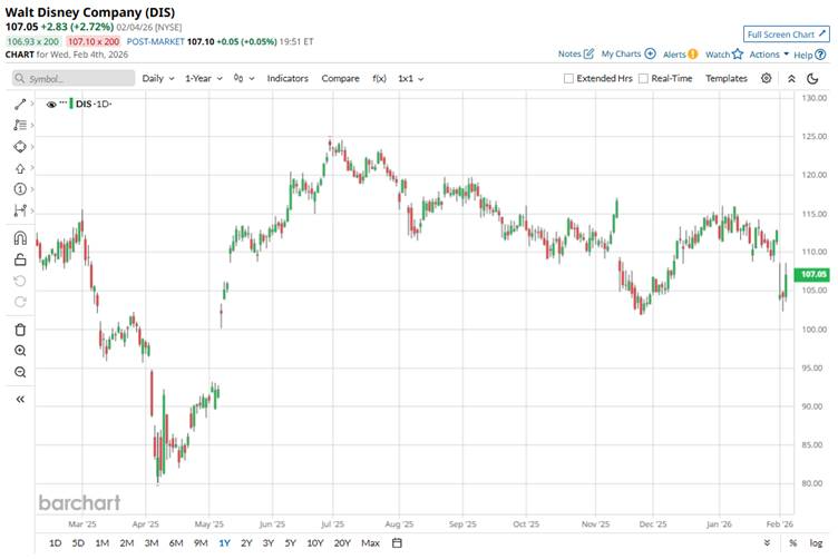 Over the past year, DIS has struggled to deliver positive returns for shareholders as its share price has trended downward amid mixed operational results and strategic uncertainty. Disney’s stock has underperformed broader markets and many sector peers, closing the last session at $105.35, around 18.36% below its 52-week high of $124.69, reached in June 2025.