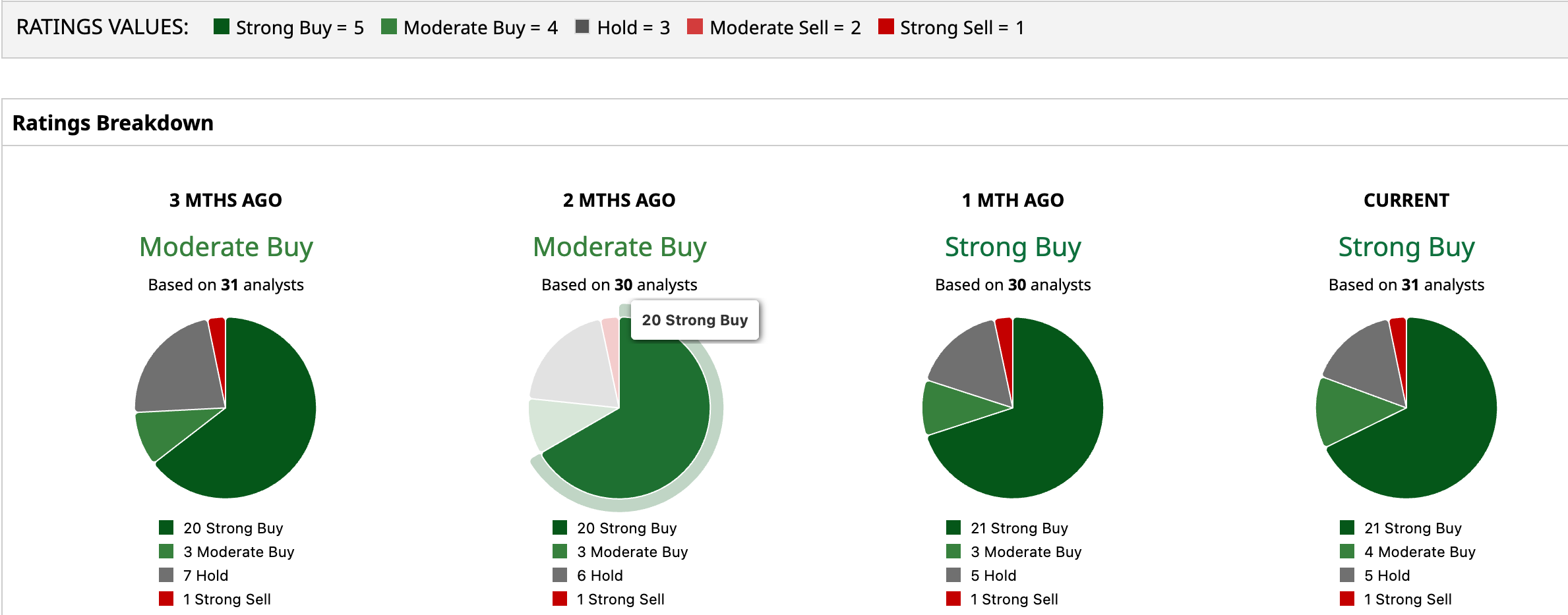 Wall Street is majorly bullish on DIS. Overall, DIS has a consensus “Strong Buy” rating. Of the 31 analysts covering the stock, 21 advise a “Strong Buy,” four suggest a “Moderate Buy,” five analysts are on the sidelines, giving it a “Hold” rating, and one recommends a “Strong Sell.”