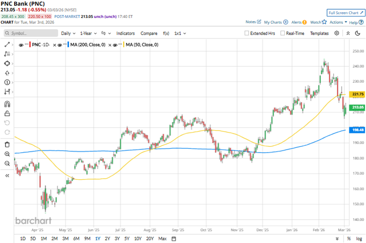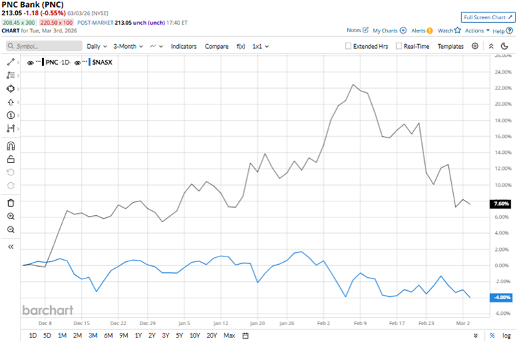 Its shares reached an all-time high of $243.94 on Feb. 6, but are down 12.7% from that level. Stabilizing interest rates, solid quarterly earnings, alongside strong loan growth and deposit increases, have boosted investor confidence. Over the past three months, PNC’s stock has gained 7.6%, while the broader Nasdaq Composite ($NASX) index is down 4% over the same period.