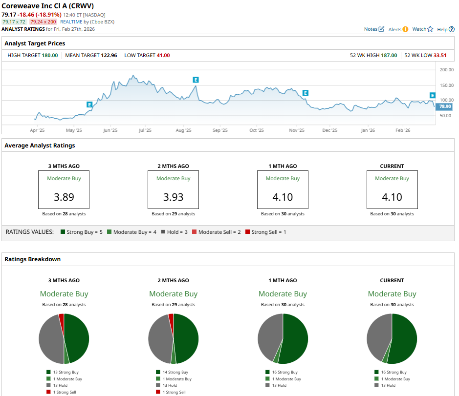 As CRWV stock continues to suffer from volatility, analysts offer a consensus “Moderate Buy” rating with a mean price target of $120.61, reflecting potential upside of 53% from current levels. The stock has been rated by a total of 30 analysts, with 16 “Strong Buy” ratings, one “Moderate Buy” rating, and 13 “Hold” ratings.
