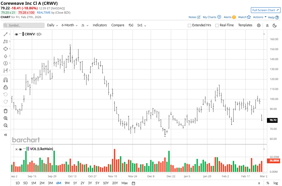 Since its March 2025 initial public offering (IPO) at $40, CRWV stock has been highly volatile amid AI hype. Currently trading near $79, the stock is up sharply from its 52-week low of $33.51 but down 58% from the 52-week high of $187. Recent five-day action shows that the stock has slipped 21% while the past one-month period reveals a 6% drop. Mixed with the 50-day moving average (MA) at $88.16 versus the 200-day MA at $110.06, the 52-week range reflects massive swings, while year-to-date (YTD) the stock is up 8% despite being off its highs.