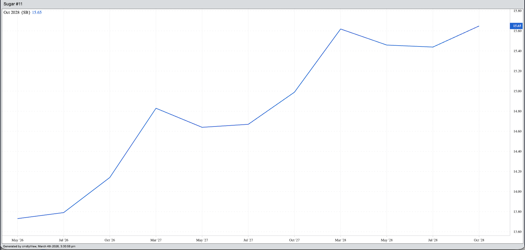 But what about sugar’s fundamentals? The market’s forward curve is showing a general contango from the May 2026 contract through the March 2027 issue, then through the March 2028 contract and so on. (Trade volume gets a bit light in the far deferred contracts.) Given the forward curve, I do not see a sudden supply scare in relation to demand. Could it happen? Of course. That’s what makes markets fun.