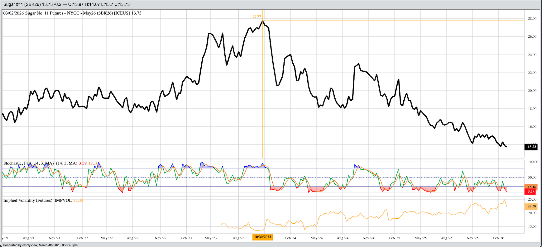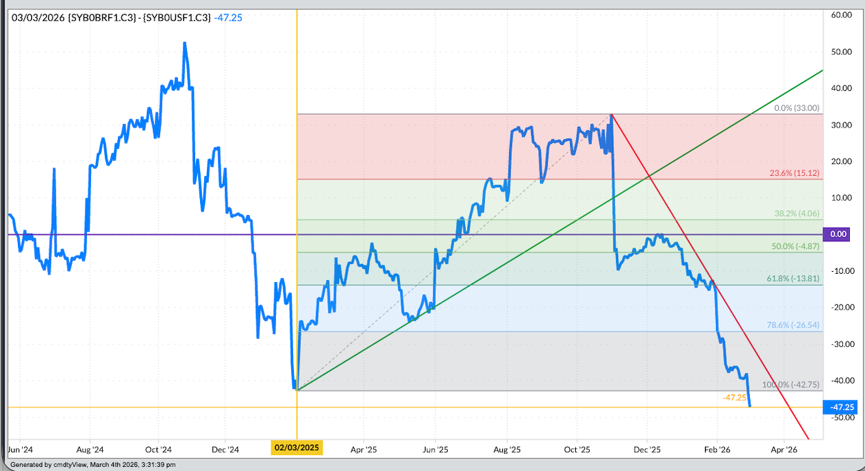 Let’s put the pieces of the sugar market together and see what we see, staring with the weekly close-only chart for the nearby No. 11 futures (SBK26) chart. Let’s block out all the noise and focus on one thing: The trend – price direction over time. What I see is as clear of a downtrend as we will find almost anywhere. It’s interesting to note the market posted a high weekly close the week of Halloween 2023, the nearby futures contract priced at 27.77 (cents per pound). As of the close on Wednesday, March 4, 2026, the nearby contract is priced at 13.73 meaning the market has lost just over 50% of its value.