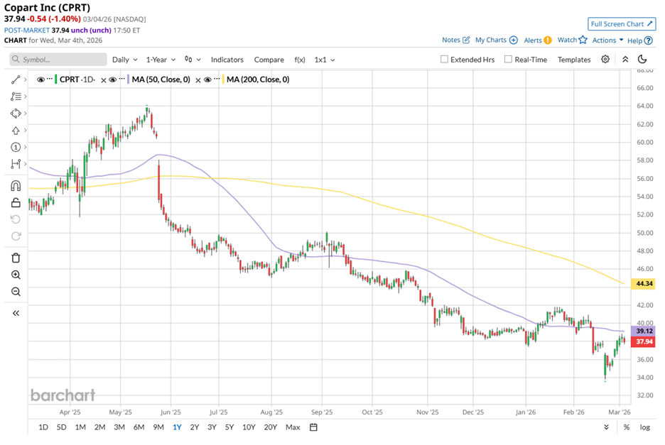 The longer-term picture is similarly weak, with Copart’s shares remaining consistently below the 200-day moving average of $44.34 since June 2025.