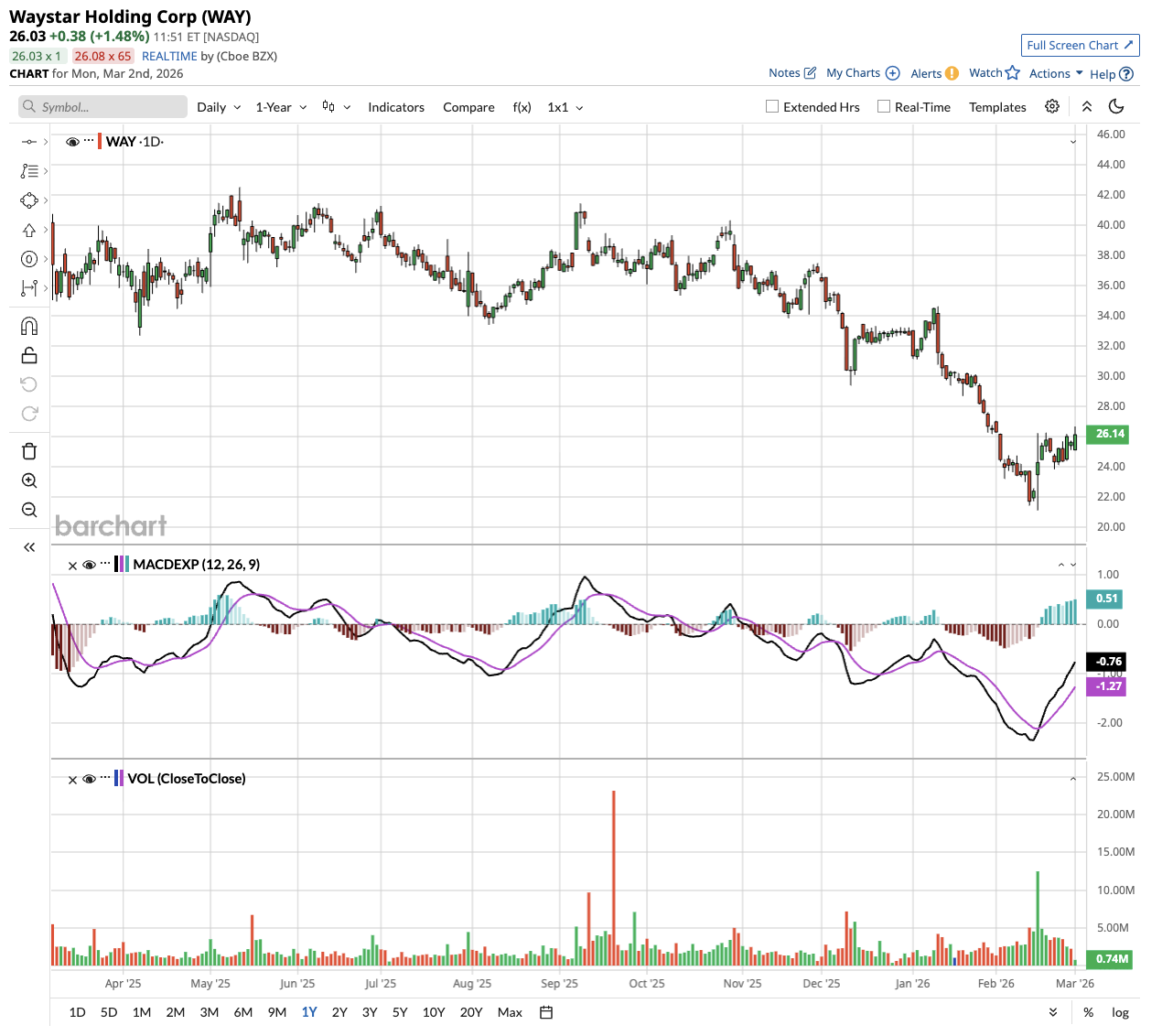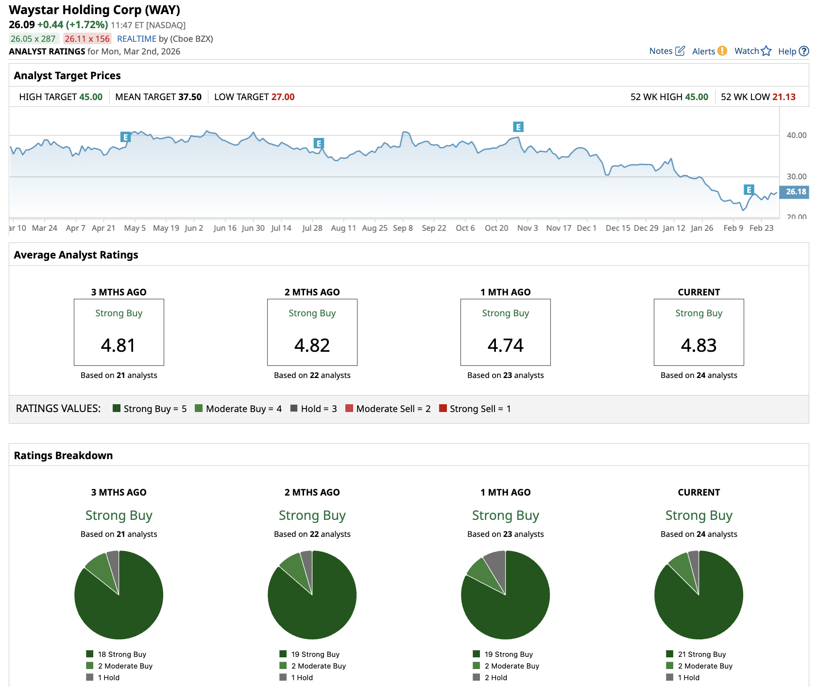 Out of the 24 analysts covering WAY stock, 21 recommend “Strong Buy,” two recommend “Moderate Buy,” and one recommends “Hold.” The average Waystar stock price target is $37.50, above the current price of $26.