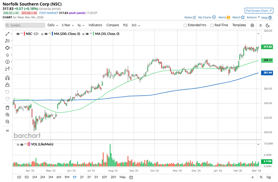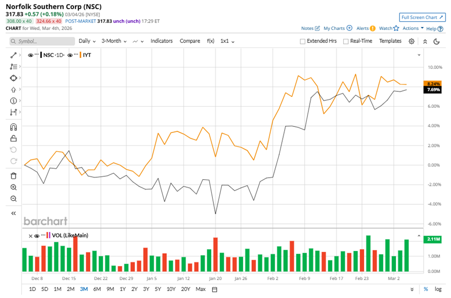 Despite its notable strength, NSC slipped marginally from its 52-week high of $319.94, achieved on Feb. 12. Over the past three months, NSC stock gained 7.7%, underperforming the iShares Transportation Average ETF’s (IYT) 8.2% gains during the same time frame.