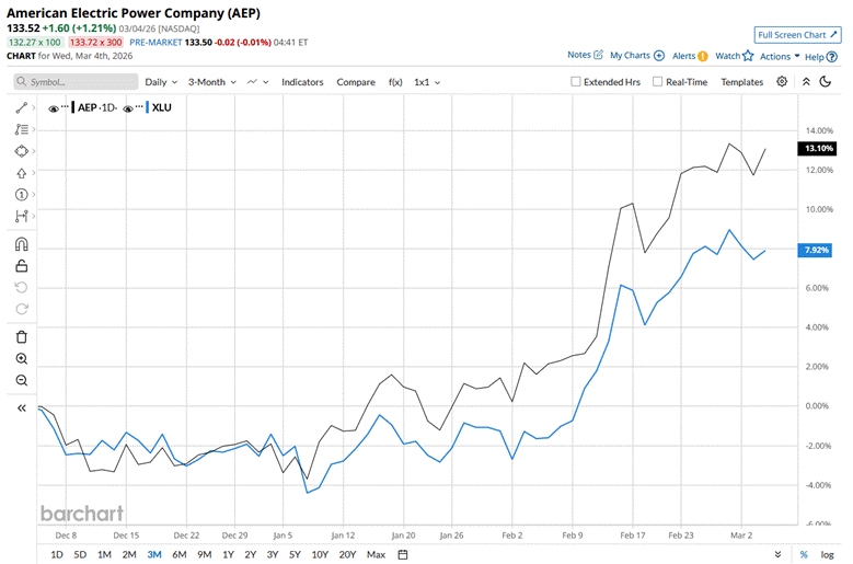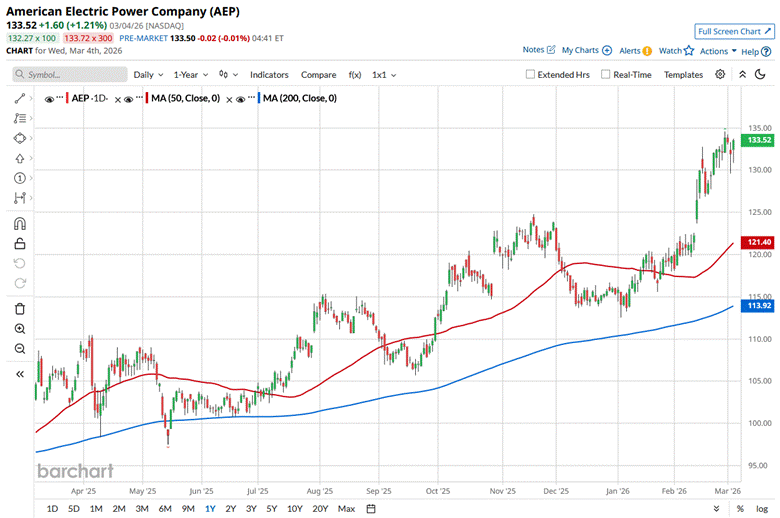 Over the past 52 weeks, the utility company’s shares surged 26.9%, outperforming XLU, which delivered 21.1% returns over the same time frame. AEP has been trading above its 200-day moving average since last year and above its 50-day moving average since the end of January, signalling bullish movement.