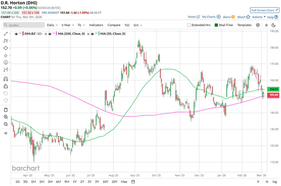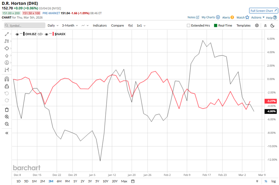 Shares of the homebuilder have fallen 18.2% from its 52-week high of $184.54. DHI stock has decreased 5% over the past three months, a more pronounced decline than the broader Nasdaq Composite’s ($NASX) 3% dip during the same time frame.