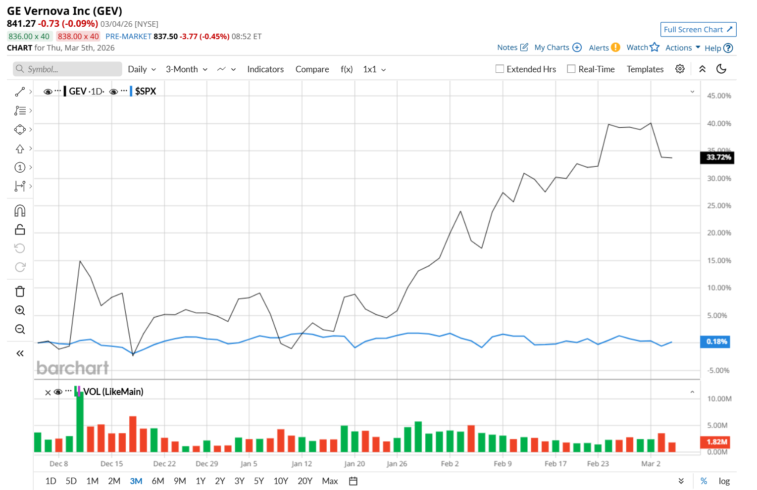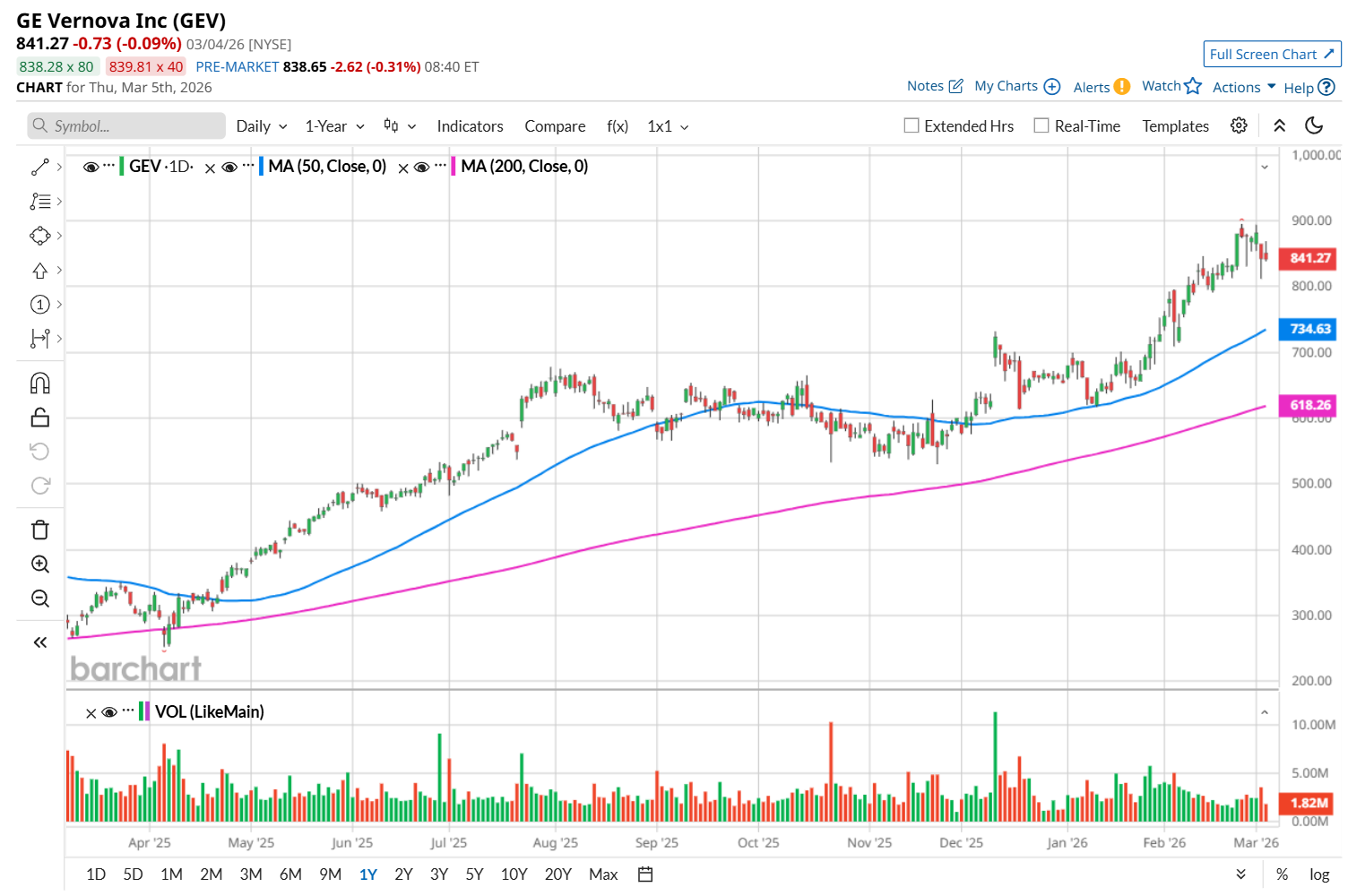This industrial giant is currently trading 6% below its 52-week high of $894.93, reached on Feb. 25. Shares of GEV have rallied 33.1% over the past three months, considerably outperforming the S&P 500 Index’s ($SPX) marginal rise during the same time frame.