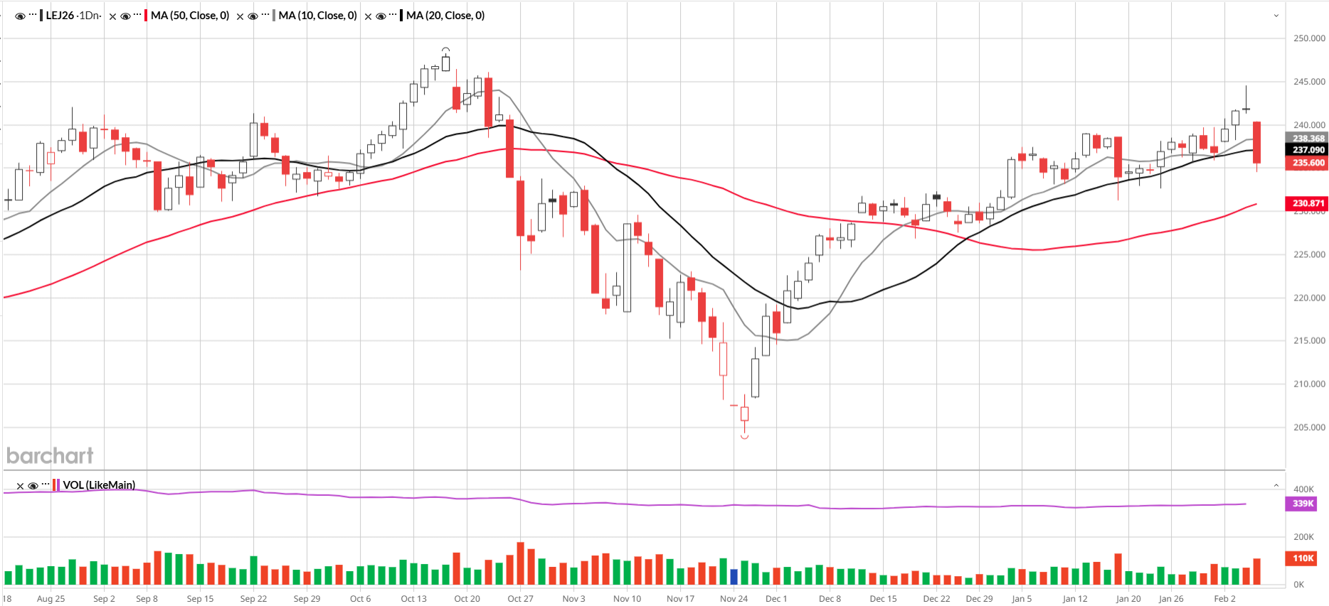 There were bids of $240 in the North today, and dressed bids of $378. However, workers voted to strike at the JBS plant in Greeley, Colorado, which weighed on futures prices today along with the overall risk-off tone in the markets this week. April Live Cattle and May Feeders began the day limit down before working their way back some during the rest of the day. April live cattle closed at 235.650, -6.15, while May feeder cattle closed at 356.600, -7.150.