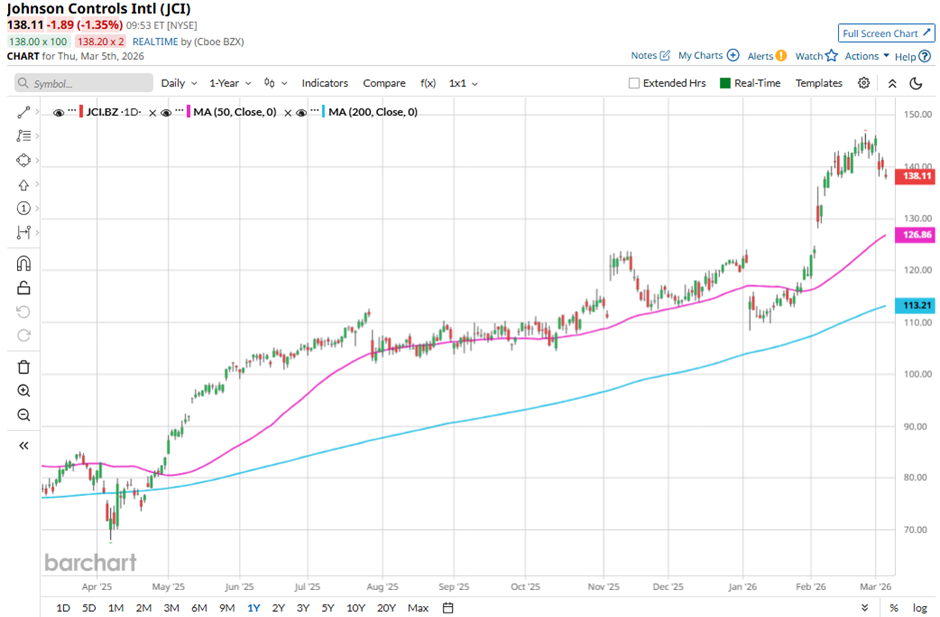Shares of the building solutions provider have declined 5.6% from its 52-week high of $146.49. JCI stock has soared 21.7% over the past three months, surpassing the broader Dow Jones Industrials Average's ($DOWI) 1.9% rise over the same time frame.