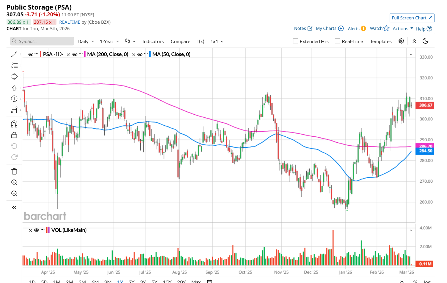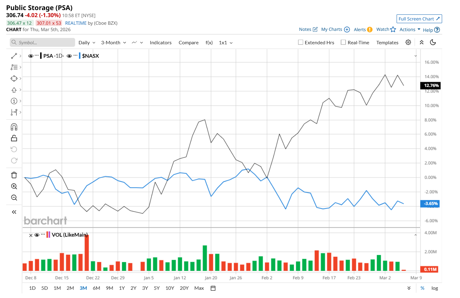 This self-storage REIT is currently trading 4.9% below its 52-week high of $322.49, reached on Mar. 10, 2025. Shares of PSA have surged 12.7% over the past three months, outpacing the Nasdaq Composite’s ($NASX) 3.4% drop during the same time frame.