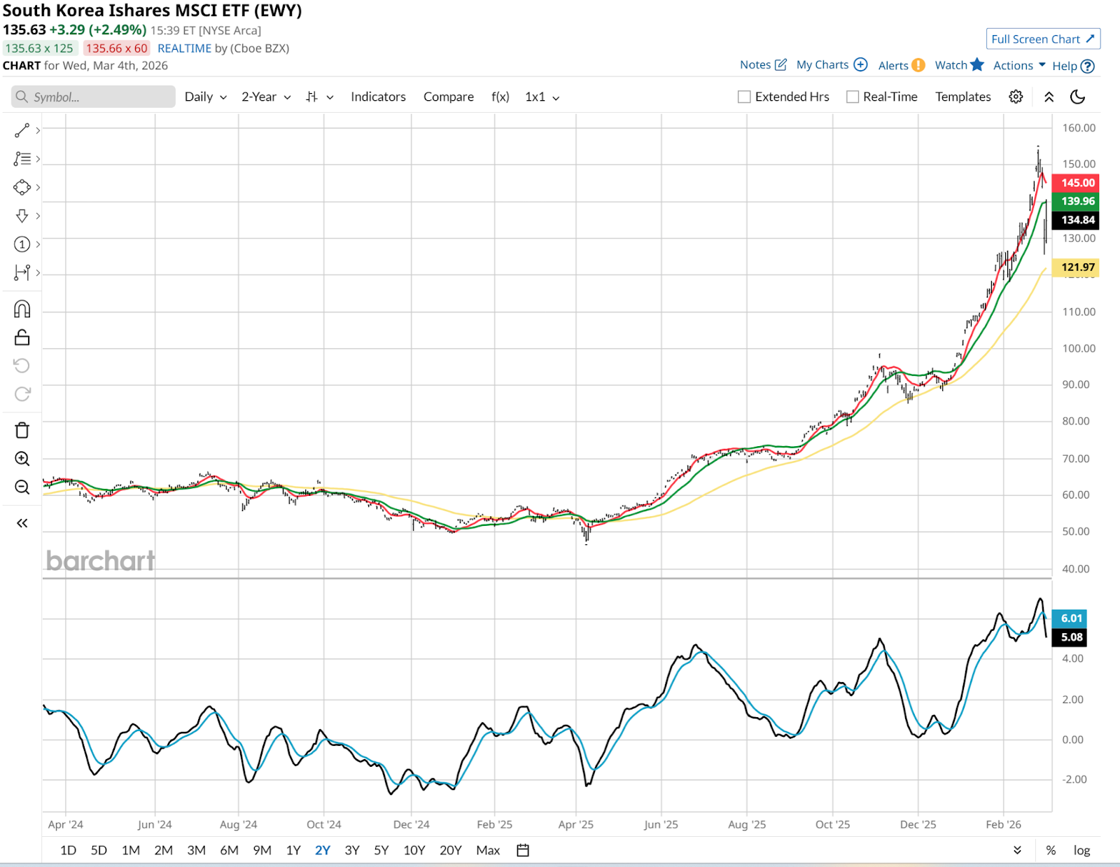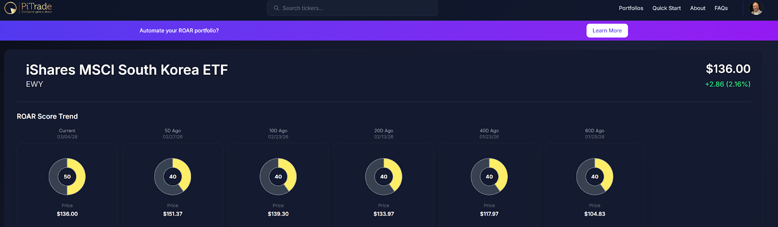 It is also a reason to break out a quick ROAR analysis of EWY, which shows that it has been in neutral territory with little interruption since flashing green (lower risk signal) more than 11 months ago, at $56 a share. Now, at $136 after a bounce during U.S. ETF trading Wednesday, EWY is still at that neutral level, with a ROAR score of 50. That leans my view toward expecting it to bounce further.