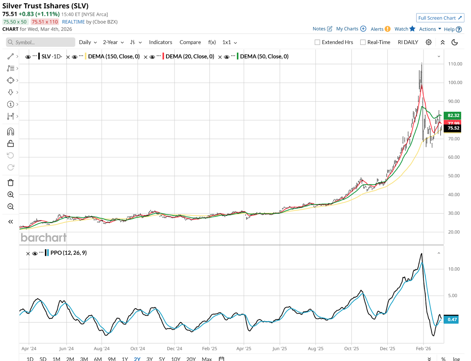 And here is SLV, which is perhaps a couple of weeks ahead of it. This might seem unrelated, but I don’t think it is. It is the manic nature of go-go modern markets, which rise and fall faster than they used to.