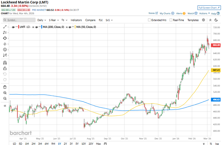 Rising global defense spending and higher demand for missiles and interceptors amid geopolitical turmoil — alongside the company’s solid cash flow generation, strong defense backlog, and robust 2026 outlook — have rewarded LMT stock. Over the past 52 weeks, LMT stock has gained 41%, while shares are up 34% year-to-date (YTD). The company’s shares reached a 52-week high of $692 on March 2, but are now down 6% from that level.