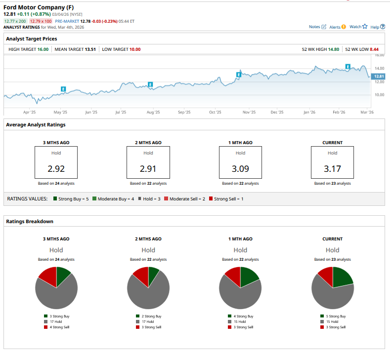 Sell-side analysts haven’t been too bullish on Ford for quite some time. Of the 22 analysts currently covering F stock, only four rate it as a “Strong Buy,” while 15 rate it as a “Hold.” The remaining three analysts rate it as a “Strong Sell,” and the stock trades above its mean target price of $13.51. Ford’s Street-low target price is $10, while the Street-high target price is $16, which is around 25% higher than current prices.