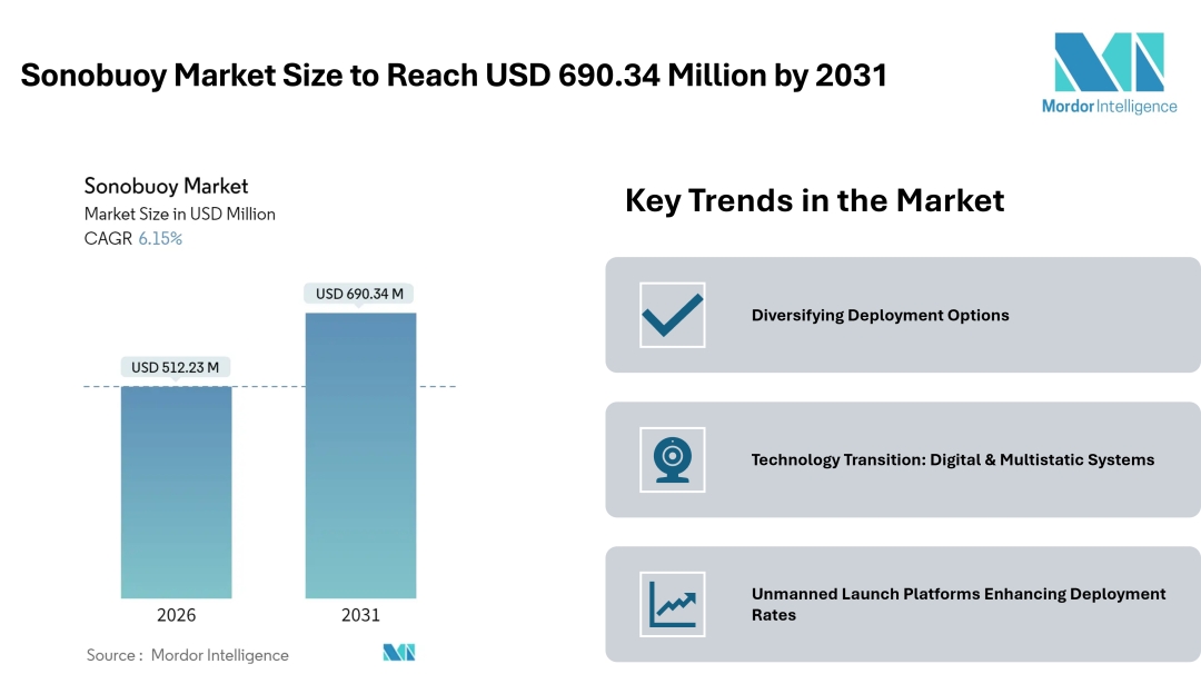 According to Mordor Intelligence, The sonobuoy market size continues to show steady expansion as naval forces and offshore operators strengthen underwater surveillance capabilities. According to Mordor Intelligence, the sonobuoy market size is estimated at USD 512.23 million in 2026, rising from USD 482.54 million in 2025, and is forecast to reach USD 690.34 million by 2031, growing at a CAGR of 6.15 percent during the forecast period. This growth reflects sustained demand for expendable acoustic sensors used in anti-submarine warfare, maritime patrol missions, and emerging commercial survey applications.