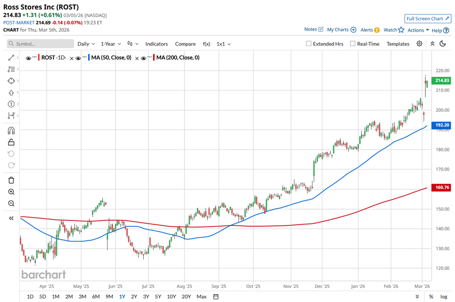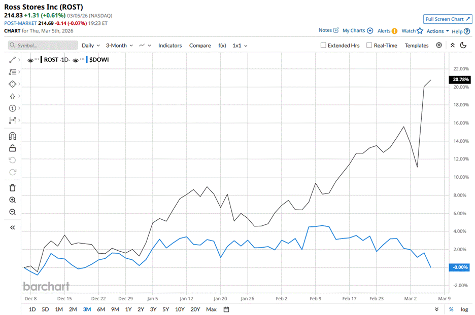 However, ROST stock is down marginally from its 52-week high of $216.80 touched on March 04. Even so, the stock has been on a solid run lately, climbing 20.8% over the past three months and clearly outpacing the Dow Jones Industrials Average ($DOWI), which remained flat during the same period.