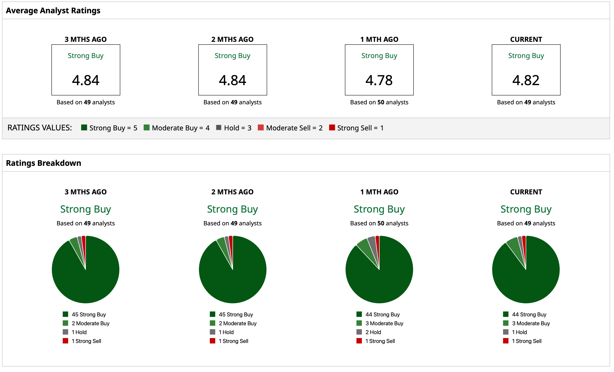 Thus, analysts have attributed an overall rating of “Strong Buy” for the NVDA stock with a mean target price of $264.38. This denotes an upside potential of about 44.4% from current levels. Out of 49 analysts covering the stock, 44 have a “Strong Buy” rating, three have a “Moderate Buy” rating, one has a “Hold” rating, and one has a “Strong Sell” rating.