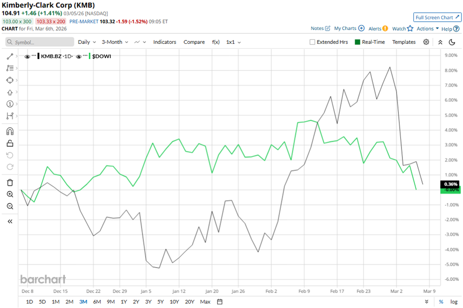 KMB stock is up 2.5% on a YTD basis, outperforming DOWI’s marginal decline. However, in the longer term, shares of the consumer products company have dipped 27.4% over the past 52 weeks, lagging behind Dow Jones' 11.5% increase over the same time frame.