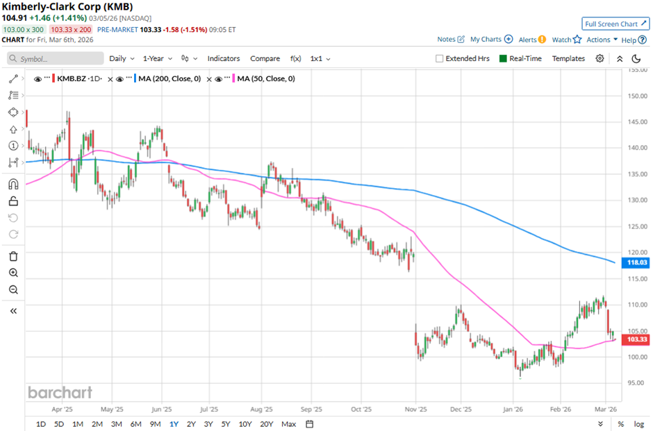 With a market cap of $34.8 billion, Kimberly-Clark Corporation (KMB) is a U.S.-based manufacturer and marketer of personal care and household products. The company operates through two main segments: North America and International Personal Care, offering products such as diapers, baby wipes, feminine and incontinence care items, and tissue products under brands like Huggies, Kleenex, Kotex, and Scott.