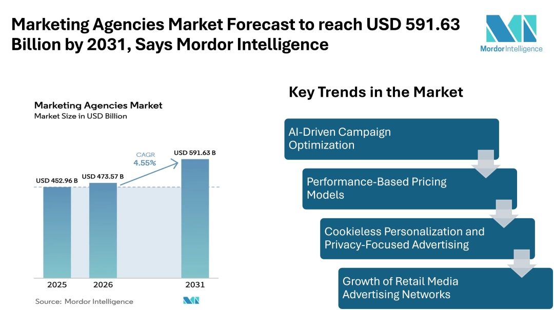 According to Mordor Intelligence, the marketing agencies market is estimated at USD 473.57 billion in 2026, increasing from USD 452.96 billion in 2025, and is projected to reach USD 591.63 billion by 2031, reflecting a CAGR of 4.55%. This steady marketing market growth highlights the continued importance of agencies in helping brands manage complex communication strategies across multiple platforms and regions.