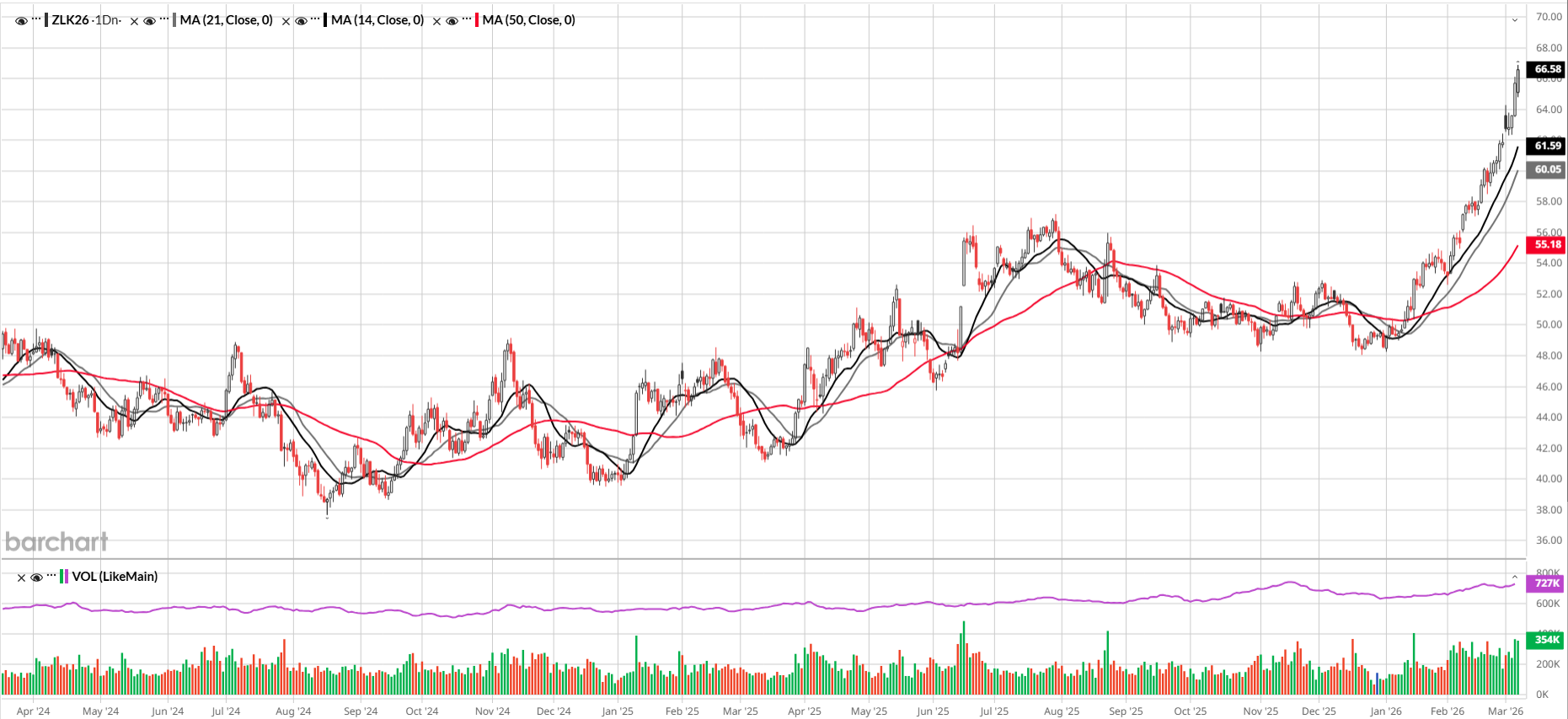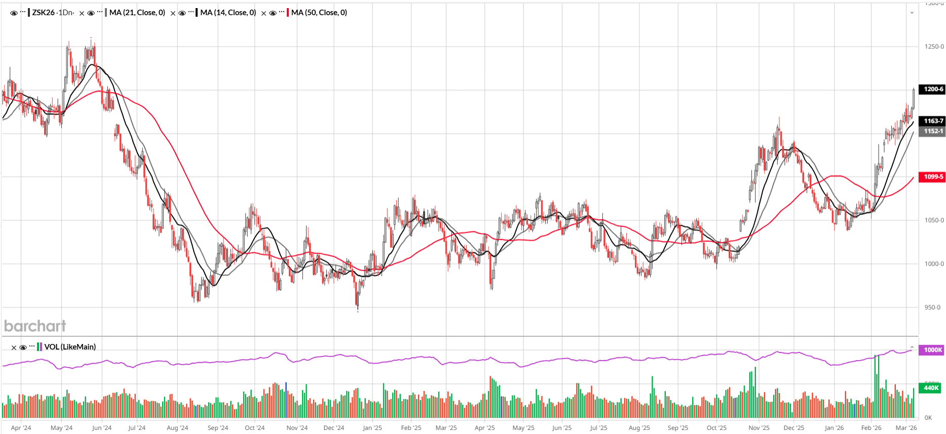 Soybeans rallied hard again today and are looking very strong technically, considering the failed double-top and prices trading above the 14, 21, and 50-day moving averages. This week, other than today, soybeans have consistently been weaker in the morning before reversing higher in the afternoon and showing strength in the overnight session. Open interest was up 7k contracts yesterday, while volume was up 76k. Soybeans have support at 1181 and 1170. Soybean oil has had an impressive rally so far in 2026 but may see a sell-off when the White House finalizes biofuel blending rates, which is expected by the end of March. I recommend buying soybeans when they’re lower, or soybean oil on a pullback for now. I still think soybeans can rally another 20-30 cents. For the longer-term, I like buying put spreads in the August contract. Acreage is expected to increase big-time, 4-5 million acres, and soybean stocks are through the roof globally and domestically. Last Friday’s COT showed managed money, with a huge 184k long position after adding 20k contracts. This Friday’s report showed funds increasing their long position to 188k contracts.
