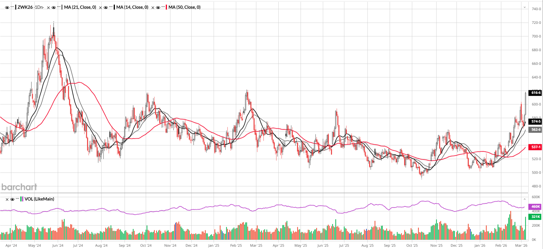After consolidating for months, wheat is rallying hard out of its base back over 600. Open interest was up over 10k contracts yesterday. The political grain has ignored fundamentals and rallied due to inflation, with short covering adding fuel to the move. Global shipping risks and the potential need for grain stockpiling are driving up prices. There is also some weather premium likely being added from damage in the EU and Black Sea, as well as drought in the Plains. Wheat is trading well above the major moving averages. Support for May wheat is at 600 and 589, while resistance is at 625.