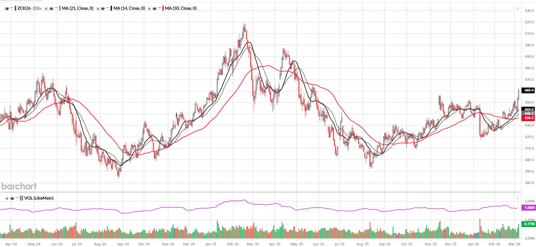 Corn is trading back above the level seen prior to the sell-off following the January WASDE report, when the USDA increased harvested acres by 1.3 million acres, and December corn is at a 21-month high. May corn made a high at 462 today. Flash sales and higher crude oil prices have supported corn. The grains have, no doubt, seen some bigger money flows coming in and some war premium with higher diesel and fertilizer prices. Corn is going to be a lot more expensive to plant relative to beans and should benefit from lower acreage numbers. It's too early now, but soon, buying corn and selling soybeans should be a great trade. The Prospective Plantings report will be released at the end of the month. Corn has resistance at 477. Support is at 454.