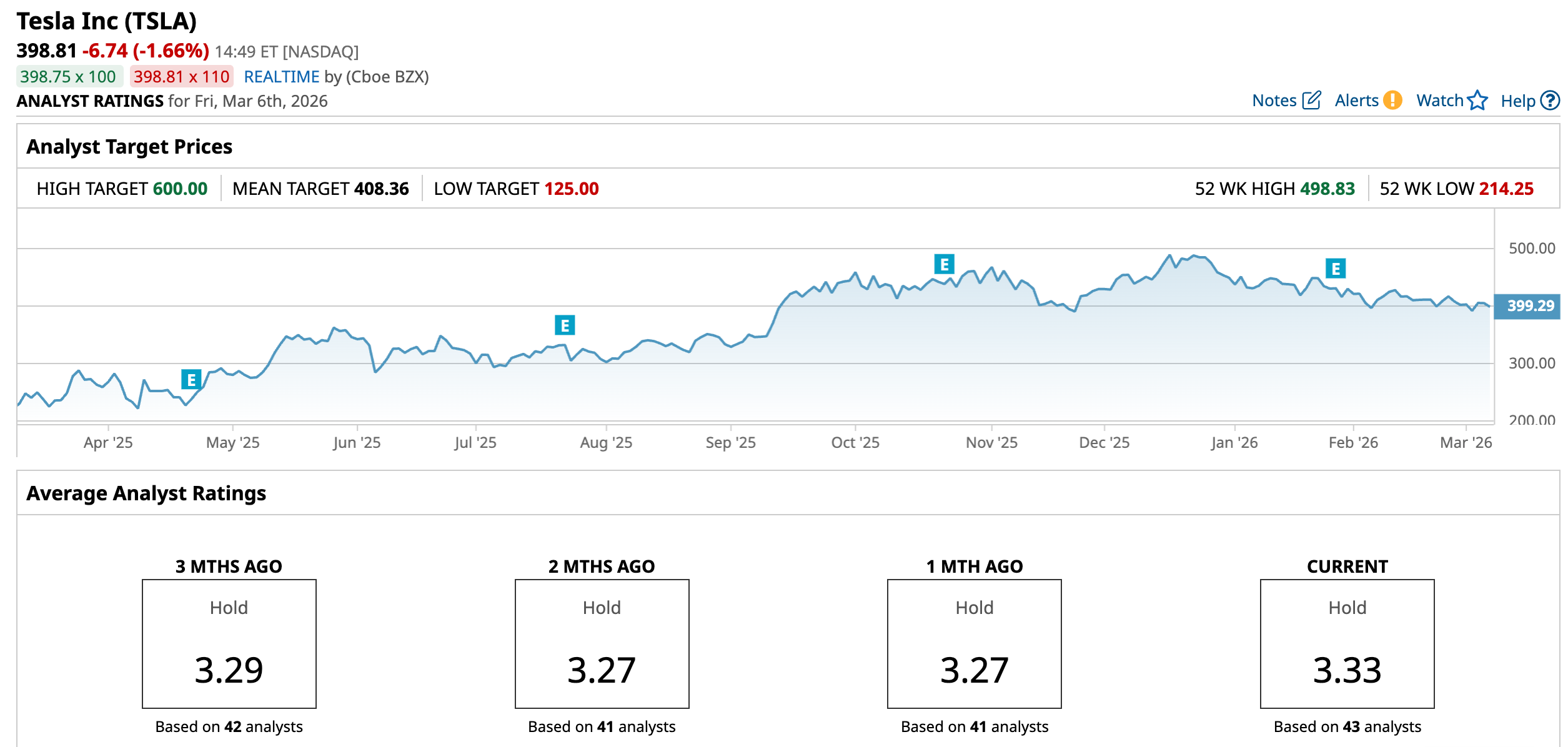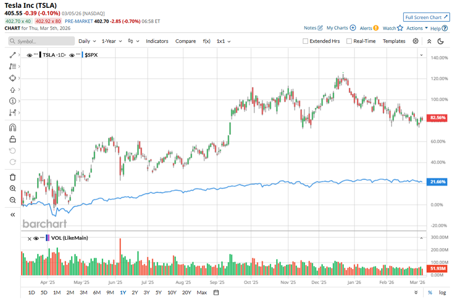 So far in 2026, shares of Tesla are down about 11.34%, trailing the broader S&P 500 Index ($SPX) which has slipped only slightly over the same period. However, the longer-term picture still looks far more impressive. Over the past year, Tesla stock has surged 51.35%, comfortably outpacing the broader market’s 17.73% gain during the same stretch.