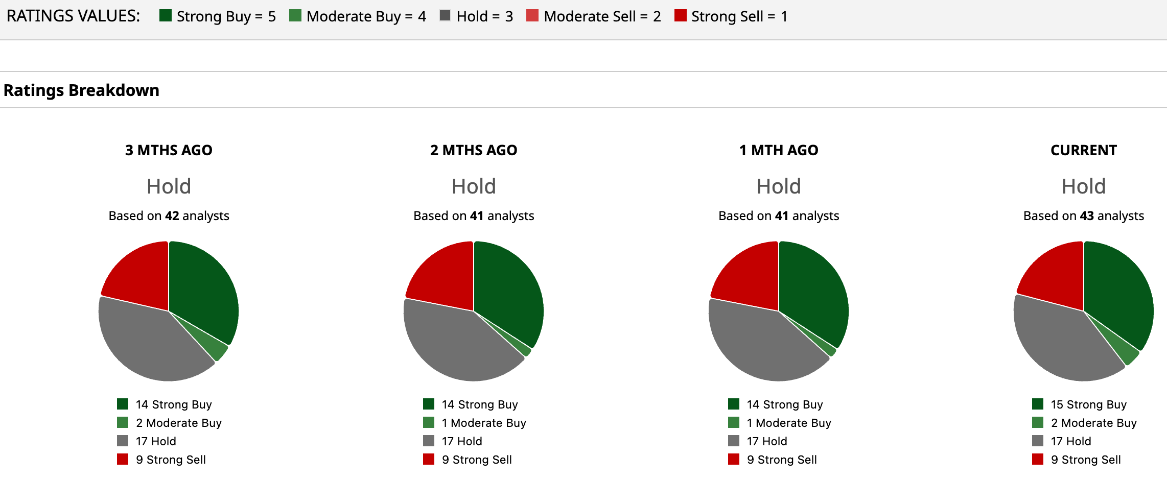 The stock currently carries a consensus “Hold” rating, reflecting the ongoing tug-of-war between Tesla’s long-term growth story and near-term uncertainties. Among the 43 analysts covering the stock, 15 rate it a “Strong Buy,” two recommend a “Moderate Buy,” and 17 prefer to stay on the sidelines with a “Hold.” On the other end of the spectrum, nine analysts maintain a “Strong Sell” rating, highlighting just how polarizing the EV giant remains among market watchers.