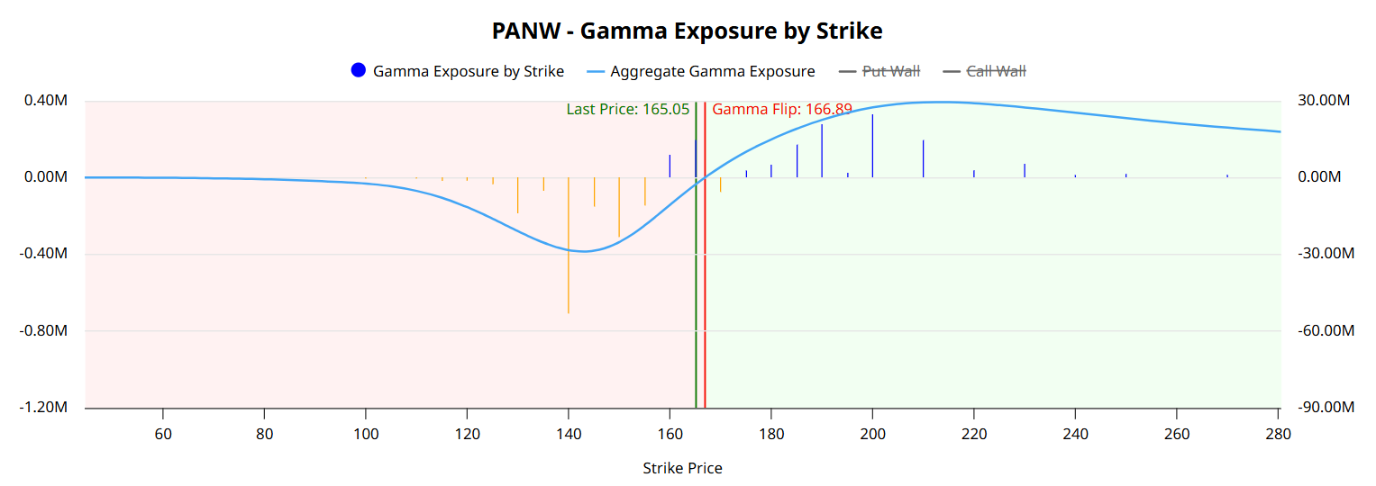 Looking at gamma exposure, the gamma flip will occur at $166.89, with the metric reaching a maximal clustering between $180 and $210. In other words, it’s at this point where dealers will be net long gamma, leading to sales of PANW stock as its share price rises.