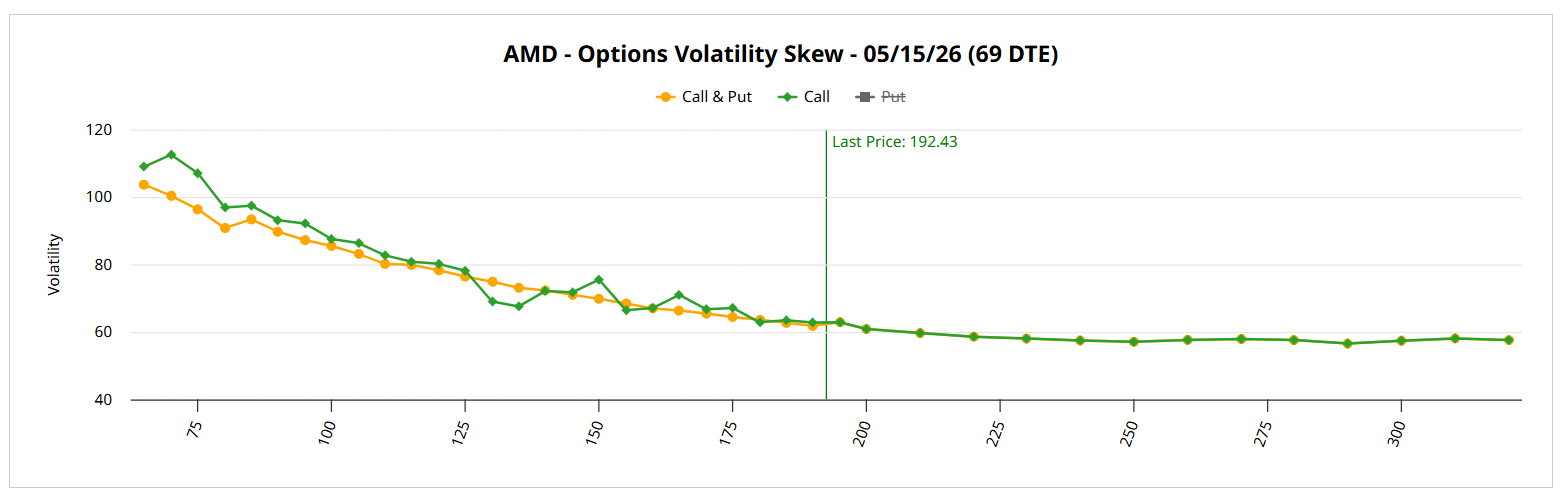 Looking at volatility skew for the May 15 expiration date, it’s quite clear that the smart money is concerned about protecting itself against further erosion. Because the skew continues to rise toward the left-hand boundaries, the prioritization is to mitigate tail risk. Further, the skew slowly declines toward the right boundaries, which means there is little motivation to seek upside convexity.
