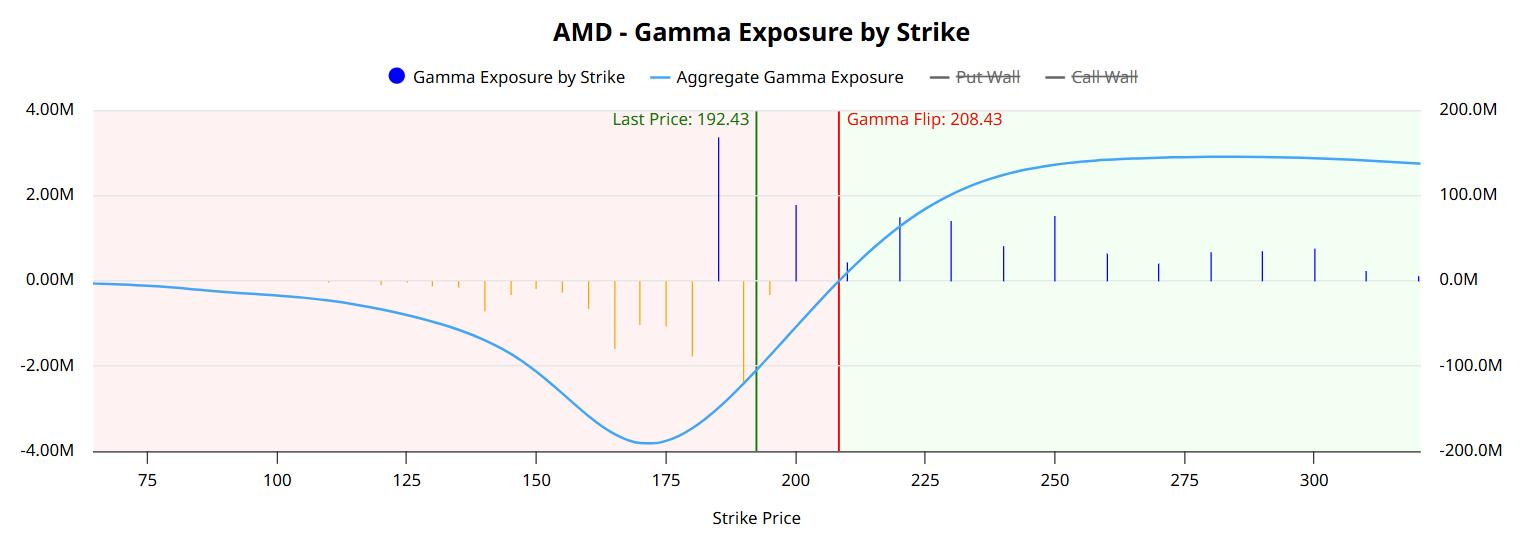 Switching over to gamma exposure, the metric’s clustering is centered roughly around the $170 to $180 strikes, with the deepest point in the aggregate gamma curve landing around $175. It’s at that point where dealers may start to buy AMD stock in a bid to stay delta-neutral.