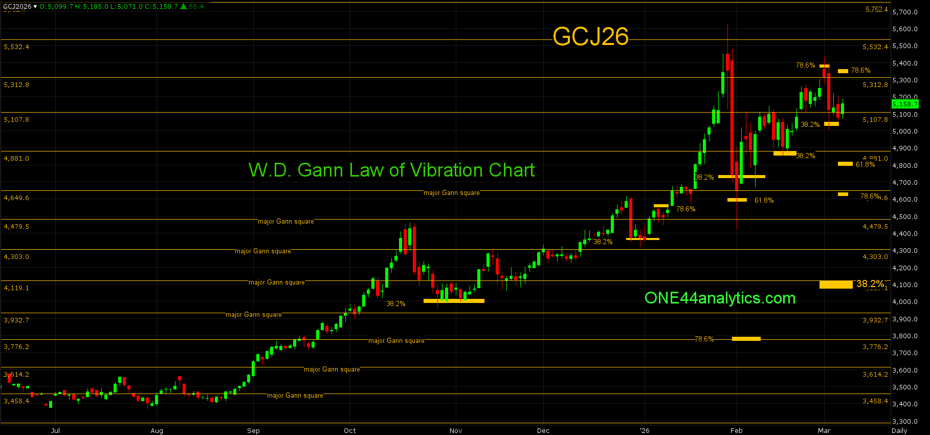 The first setback from the 2/11/26 high hit 78.6% the other way on 2/17/26 at 6808.00 and that sent it 78.6% the other way again on 2/25/26 at 6966.00. We will now see if the break from 6966.00 (78.6%) will be the end of the Bull run for now. Friday's close was just below the 6752.00 major Gann square and this will be the key level for the week.