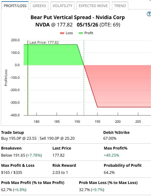 Some interesting trades here with impressive Max Profit Percentage. Let’s take a look at the first item in the table – a bear put spread on Nvidia (NVDA).
