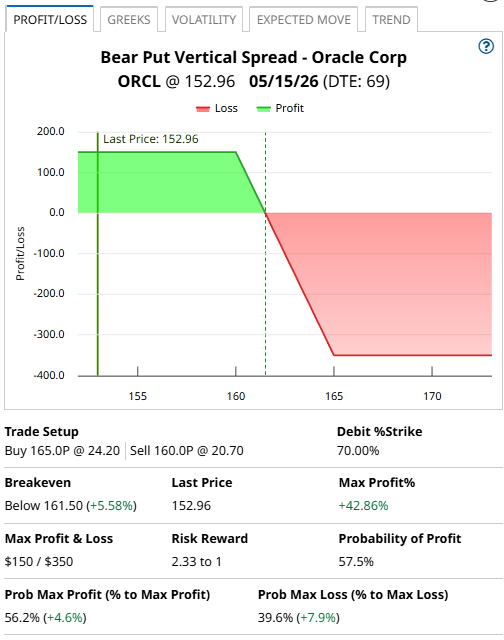 The Oracle trade is also using the May 15 expiry and involves buying the $165 strike put and selling the $160 strike put.