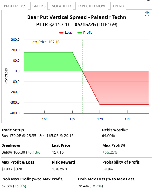 The first Palantir bear put spread is also using the May 15 expiry and involves buying the $170 trike put and selling the $165 strike put.