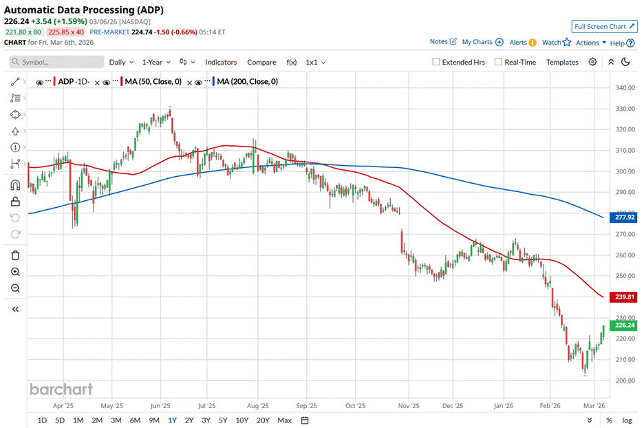 ADP has been trading below its 200-day and 50-day moving averages since last year, exhibiting bearish momentum.