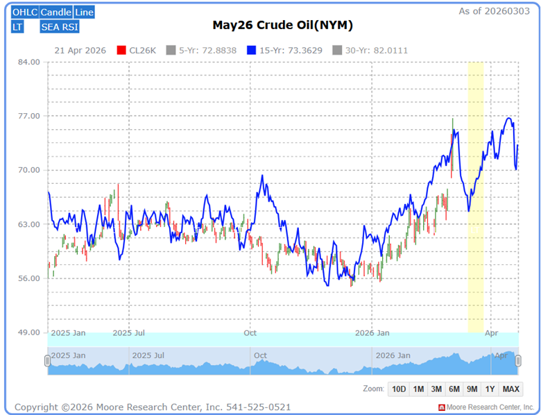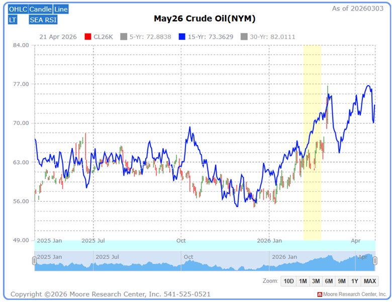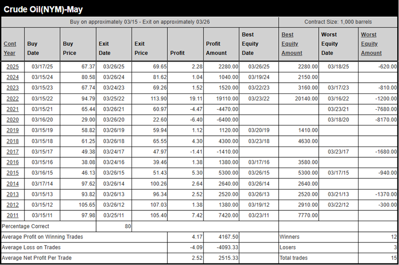 The seasonal buying window research shows that WTI has closed higher on about March 26 than on March 15 for 12 of the past 15 years, an 80% occurrence. During this 12-calendar-day window, the pattern has returned $2.52 in hypothetical profits, or $2,515.33 per contract.