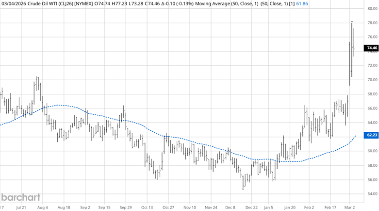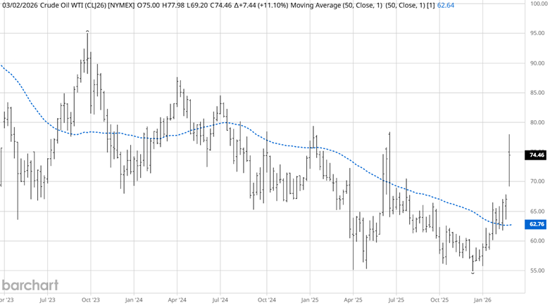 This geopolitical risk builds on another structural price force: seasonal demand dynamics. The crude oil market exhibits a well-established pattern in which prices typically bottom in December and then begin a spring rally that often lasts through late April or early May. This pattern is driven in large part by refiners’ forward purchasing ahead of the Northern Hemisphere’s peak summer driving season. As vacationing consumers hit the roads from May through August, gasoline demand, the primary refined product from WTI crude, rises sharply, drawing down inventories and incentivizing refiners to accumulate crude in advance. In a recent article for Barchart, Crude Oil Breakout Backed by Seasonals, Technicals, and COT Report, I detailed this seasonal pattern and will discuss it later in this article.