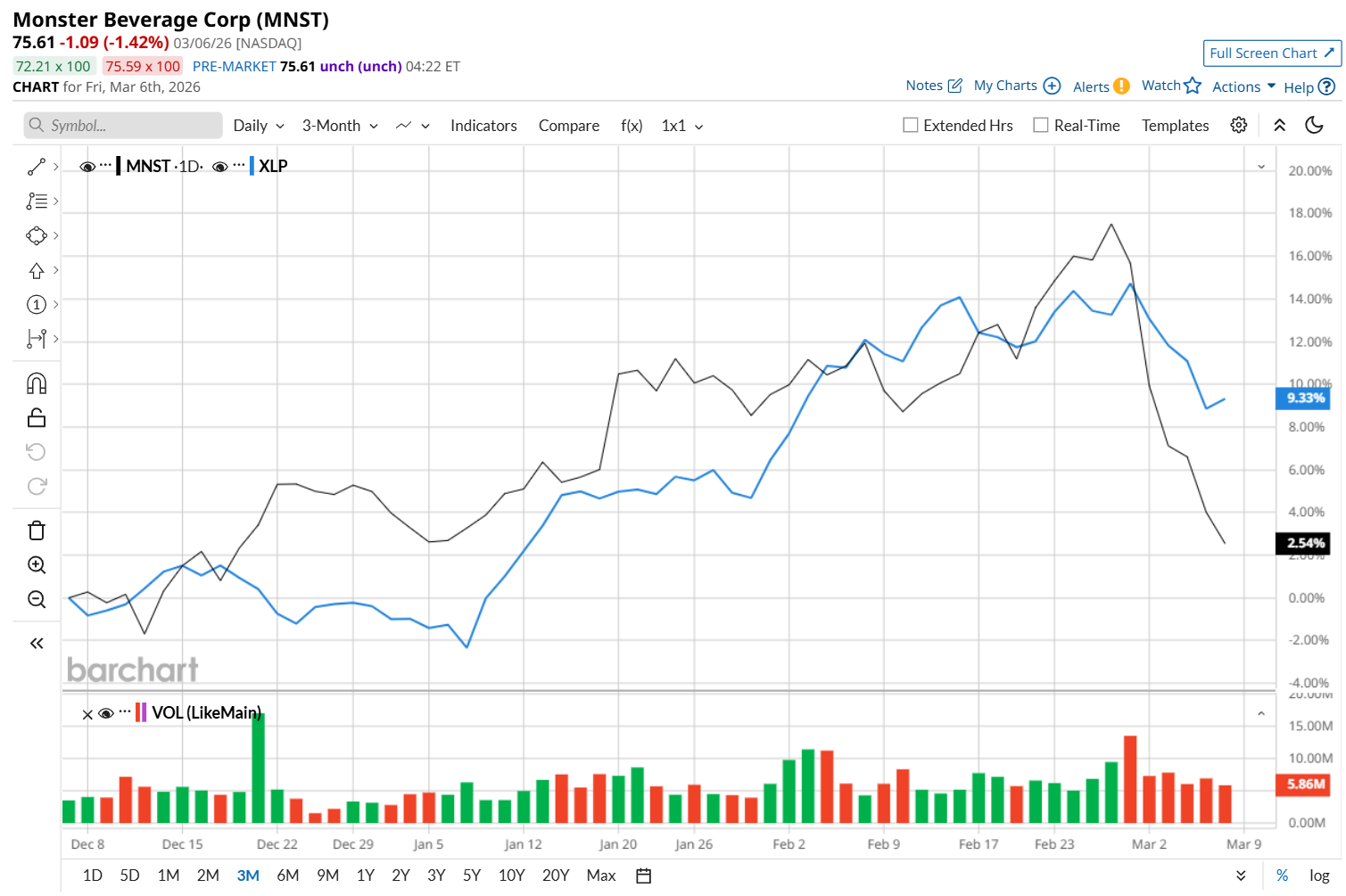 This energy drinks manufacturer is currently trading 13.5% below its 52-week high of $87.38, reached on Feb. 27. Shares of MNST have gained 2.5% over the past three months, lagging behind the State Street Consumer Staples Select Sector SPDR ETF’s (XLP) 9.3% rise during the same time frame.