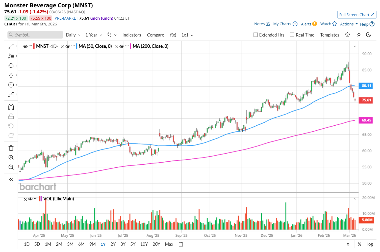 To confirm its recent bearish trend, MNST has started trading below its 50-day moving average since early March. However, it has remained above its 200-day moving average over the past year.