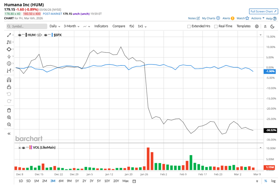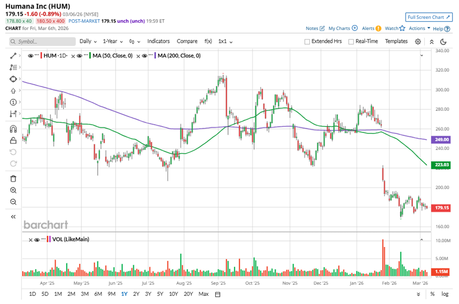 To confirm the bearish trend, HUM has been trading below its 50-day and 200-day moving averages since late January.