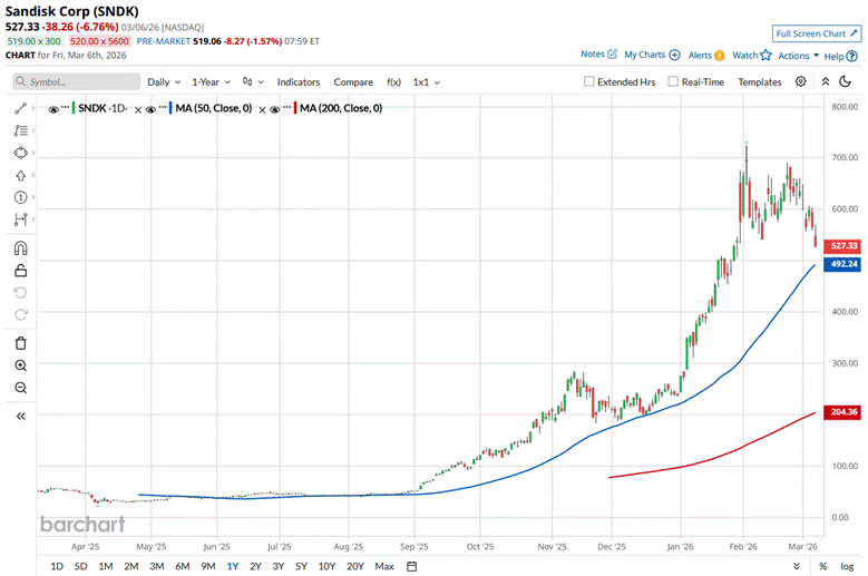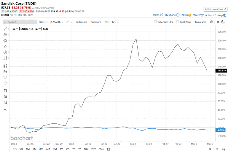 However, the stock currently trades 27.3% below its 52-week high of $725 recorded on Feb. 03. SNDK has grown 130.8% over the past three months, notably outperforming the State Street Technology Select Sector SPDR ETF’s (XLK) 6.4% decline during the same time frame.