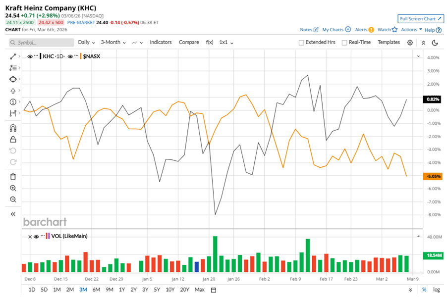 Despite its notable strength, KHC slipped 26.4% from its 52-week high of $33.35, achieved on Mar. 10, 2025. Over the past three months, KHC stock gained marginally, outperforming the Nasdaq Composite’s ($NASX) 5.1% losses during the same time frame.